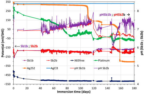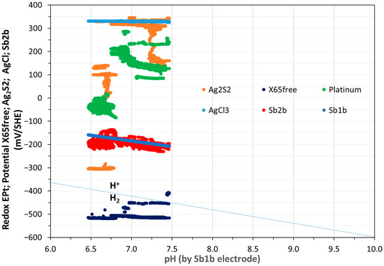 Figure 7 shows the OCPs of platinum, Ag2S, Sb2O3, AgCl3(s) and X65 free vs. pH over 180 days in a Pourbaix-type diagram. A straight line from −360 mV to −600 mV indicates the lower stability limit of water (H+/H2).