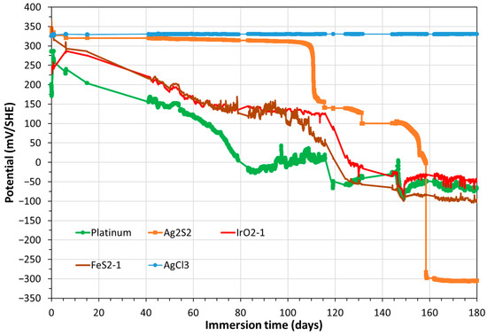 Figure 6 presents the OCP temporal variations of three other electrodes (AgCl3, IrO2, and FeS2) in addition to platinum and Ag2S.