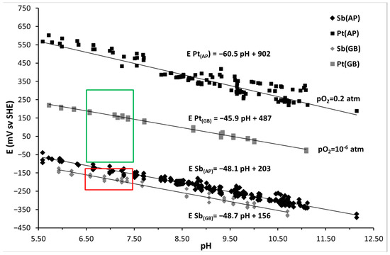 Sb2O3/Sb and PtO/Pt calibration curves under AP (pO2 = 0.2 atm; black symbols) and in GB (pO2 = 10−6 atm; gray symbols) at 25 °C. The variations in Pt and Sb2O3 potentials vs. pH clearly show the micro-oxic and, finally, anoxic state of the pore water. PtO/Pt and Sb2O3/Sb show near-Nernstian behavior. Green and red rectangles surround the evolution of platinum and Sb2O3, respectively.