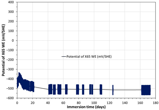 Figure 9 shows the temporal variation of the OCP of X65 WE electrode vs. SHE over 180 days. It clearly identifies the periods of polarizations applied to X65 WE by the three electrochemical techniques for corrosion measurements, the most disturbing one being VaOCP at ±50 mV/OCP of X65 WE. It also makes it possible to assess the impact of the electrochemical measurements on the X65 WE. The comparison between the OCP values provided by X65 WE and X65 free after electrochemical loops shows that the OCP values of the X65 WE agreed with those measured by X65 free, i.e., the electrochemical methodology developed during this work appears non-disturbing for a better insight into the corrosion rate measurement.