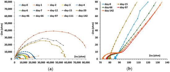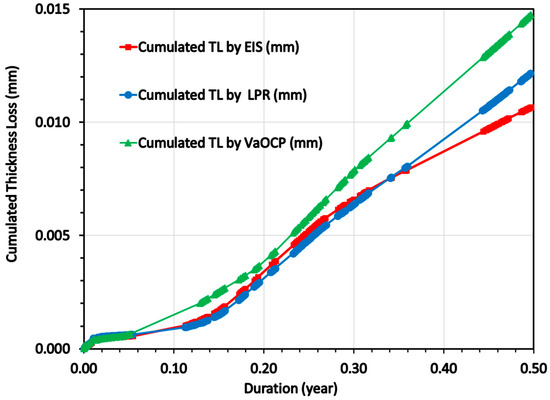 Figure 12 shows that the CCD values (in µA/cm2) obtained with the three techniques were close to one another. Their initial slight divergence began in the third month and increased progressively, with an EIS value lower than the LPR and VaOCP ones. The greatest difference between LPR and EIS was 15%, 4 months after the start of the experiments. Between 165 and 180 days, the measured CCDs fluctuated within 1.8 µA/cm2 (EIS), 2.8 µA/cm2 (LPR) and 3.0 µA/cm2 (VaOCP), or a difference of 40% between the two extreme values. The reason for this difference is that the impedance signals became less accurate over time. Indeed, the capacitive loops at low frequencies were less and less well-defined. The Rp values were, thus, obtained by extrapolation from the beginning of the arc. The noted divergence, which gradually increased between the two methods over the last two months, is proof that the EEC model Re(Q1Rp) was incomplete for the end of the experiment.