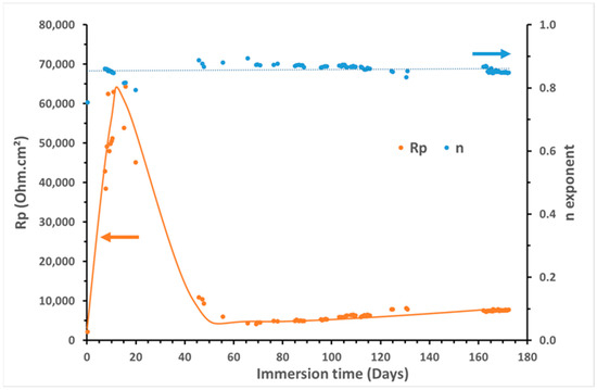 where Jcorr is the corrosion current density (A/m2), B is the Stern–Geary constant (V), Rp is the polarization resistance (Ω), A is the exposed (polarized) surface of steel (m2), and βa and βc are the anodic and cathodic Tafel constants (V), respectively. Although this can be rapidly and easily observed, the Jcorr values could be unrealistic for continuous corrosion monitoring because the exchange current was obtained by fitting the anodic and cathodic branches of the current-overpotential curve [39]. This is why Tafel plots were banished from this long-term study and replaced by VaOCP, from which βa and βc were obtained.