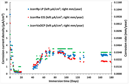 The corrosion current density, CCR or Jcorr, ref. [33,34], was determined from the electrochemical measurements of the polarization resistance Rp by LPR, VaOPC, or EIS [35,36].