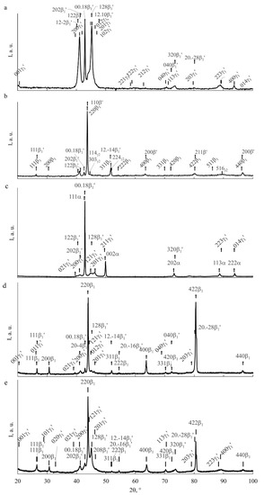 It is known that in alloys of the Cu-Al-Ni system at a temperature of 838 K (TED) and below, under equilibrium conditions, the eutectoid decomposition β→α + γ2 occurs. The period aα of the crystal lattice of the α phase is close to 0.361 nm, with its FCC lattice being of the type A1. The period aγ2 of the crystal lattice of the γ2 phase (based on the intermetallic compound Cu9Al4 with a cubic lattice of the D83 type) is close to 0.870 nm. In addition, precipitates are formed at temperatures below the TED of the β′2 phase with a BCC lattice of the type B2′ based on NiAl (aB2′ is close to 0.289 nm) [1,8,16]. In previous studies, it was found that the quenching of alloys of the Cu-Al-Ni system from a single-phase β region of existence prevents eutectoid decomposition [10,11,12,13,14,15,16]. Additives 3, 4, and 4.5 wt% Ni reduce the diffusion mobility of copper and aluminum atoms, thereby restraining the eutectoid decomposition of the high-temperature β phase during quenching, whereas an increase in the content of aluminum leads to a decrease in the critical temperatures of the start (Ms, As) and finish (Mf, Af) of the forward (Ms, Mf) and reverse (As, Af) TMTs [16]. At the same time, it is important that in the process of cooling or heat treatment at temperatures above Ms, along with decomposition, the atomic ordering occurs by the sequence A2(β)→B2(β2)→D03(β1). The long-range atomic order of the austenitic atomically ordered β1 phase is inherited by martensite, which, as a consequence, ensures the thermoelasticity of the latter [1,7]. As our cooling in air of the Cu-Al-Ni alloys after forging did not allow us to prevent its eutectoid decomposition, we performed the procedure of quenching in water from the temperature 1223 K, with preliminary holding exposure for 10 min. According to X-ray studies, it was found in forged quenched alloys with an aluminum content of 10 and 14 wt% Al, due to a TMT with the formation of twinned martensitic phases according to the schemes β1(D03)→β′1(18R) (with the parameters of the long-period monoclinic lattice 18R close to a = 0.4450 nm, b = 0.5227 nm, c = 3.8050 nm, β = 91.0°) and β1(D03)→γ′1(2H) (with the parameters of the orthorhombic lattice 2H close to a = 0.4390 nm, b = 0.5190 nm, c = 0.4330 nm) (Figure 1a).