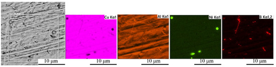 To reduce grain sizes in the alloys of the Cu-Al-Ni system, the test on the effect of boron alloying of various concentrations was carried out and comprehensively investigated. The cooling of the cast alloys Cu-10Al-(3, 4.5)Ni-(0.02–0.3)B, as well as Cu-14Al-(3, 4)Ni-(0.02–0.3B), in air was accompanied simultaneously by (i) eutectoid decomposition according to the reaction β→α + β′2 + γ2 and (ii) the formation of β′1 martensite. Figure 4 shows an example of an SEM image of a microstructure together with the mapping over chemical elements of the Cu-10Al-3Ni-0.3B cast alloy in the characteristic radiation. In particular, image analysis has shown that the Ni-Al and Al-B particles are present in the alloy.