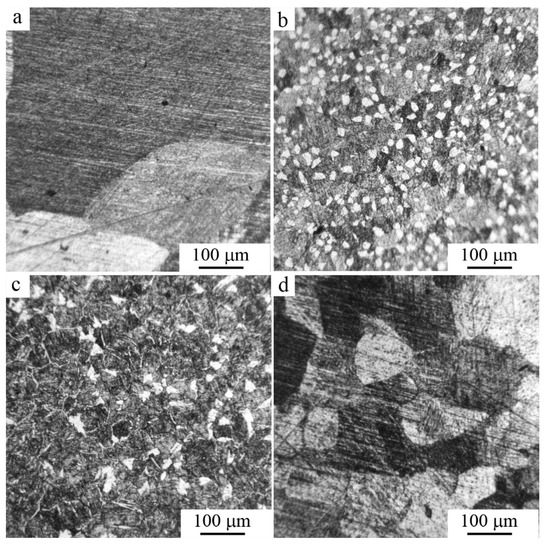 At the same time, the formation of the microcrystalline structure of alloys with grain sizes of 300–450 microns was observed (Figure 5). Boron particles with sizes of 150–400 nm, localized both at the boundaries and in the volume of grains, are clearly distinguished by contrast (see Figure 5d). The Ni–Al-based disperse β′2 phase precipitates had dimensions not exceeding 1 micron (see Figure 4). The β′2-phase particles were previously detected by us in direct resolution by the TEM method in the Cu-14Al-4Ni alloy after its equiaxial compression at 1223 K. It has been established that this phase is precipitated at temperatures below the TED, mainly heterogeneously along the boundaries, and with prolonged cooling of the alloy in air, this takes place also in the volume of α grains [12].