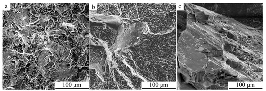 The fractographic analysis of Cu-Al-Ni alloys with boron addition after tensile tests showed that the fractures have a quasi-tough character, unlike the alloys without boron. Figure 10a,b clearly shows areas of both the river (brook) and shallow-dimple character of the fracture, as well as the smooth zones of intragrain cleavage. Localized boron particles in the body of a grain and along the grain boundaries, apparently, provided an increased deformability of alloys with the appearance of a tough fracture mechanism. The alloy with the lowest boron content (0.02 wt%) was characterized by a brittle intercrystalline fracture, which occurred along the grain boundaries and martensite packets (Figure 10c). Such a concentration of boron, apparently, did not provide high tensile plasticity, but, nevertheless, allowed us to achieve increased values of the tensile strength σu and elongation to fracture δ.