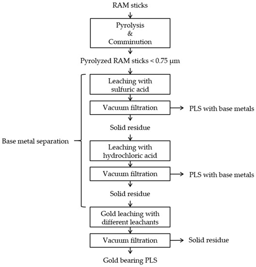 In this study, gold leaching from waste printed circuit boards (WPCBs) was investigated, incorporating a series of pretreatment steps: pyrolysis of whole WPCBs, size reduction, and multistep acid leaching for base metal removal with two different sets of parameters. Pyrolysis is a thermal pretreatment method that aims to remove or separate non-metallic components, specifically organic compounds of PCBs, and to loosen the layers of the board, hence facilitating the subsequent size reduction and liberation of metals [29,30,31]. The proposed method avoids the use of sieving to prevent losses of valuable metals, in particular precious metals (PM). A two-stage acid leaching process is implemented to maximize base metal removal and accelerate the subsequent gold leaching. The material will then be treated with various leaching agents and conditions to determine the most efficient leaching agent for maximum gold recovery.