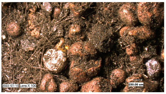 Optical microscopy image of the pyrolyzed and crushed RAM (<0.75 mm) at 100× magnification.