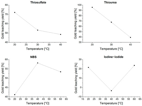 The relationship between changing reaction temperature and gold leaching yield in thiosulfate (top left), thiourea (top right), NBS (bottom left), and iodine–iodide (bottom right) solvent systems from pyrolyzed and chemical-pretreated RAM.
