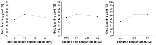 The solvent compositions of the thiourea and thiosulfate trials are presented in Table A1 and Table A2, respectively. The effect of higher and lower concentrations of iron(III) sulfate, sulfuric acid, and thiourea—with TS 1 as reference trial—were investigated separately (Figure 10).