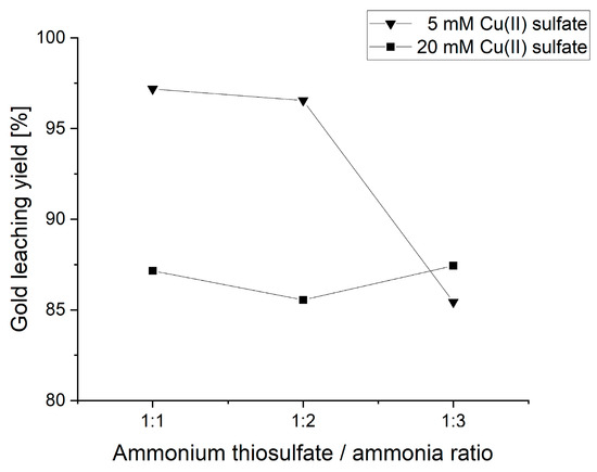 For both scenarios of cupric ion concentration, 5 mM and 20 mM, an increase in the concentration of ammonium thiosulfate and ammonia generally resulted in higher gold recovery. When comparing the leaching trials conducted with 5 mM Cu(II) sulfate, the trial with the lowest amounts of ammonium thiosulfate and ammonia, which were 0.1 M and 0.2 M, respectively, achieved the minimum gold recovery. The other two trials showed comparable gold recoveries >85%. In the leaching trials with additional 20 mM Cu(II) sulfate, only the trial with the highest ammonium thiosulfate and ammonia concentration reached a leaching yield greater than 85%. With a lower concentration, the gold dissolution was inefficient, especially in the case of 0.2 M (NH4)2S2O3 and 0.4 M NH₄OH, achieving an outlier of only 49% gold recovery. These results suggest that when more cupric ions are present in the solution, higher ammonium thiosulfate and ammonia concentrations are required to achieve the same leaching yield than with fewer cupric ions. Since more ammonia was present in the solution to consume the excess cupric ion, the oxidative degradation of thiosulfate by cupric ion was reduced, allowing more thiosulfate to remain for gold complexation.