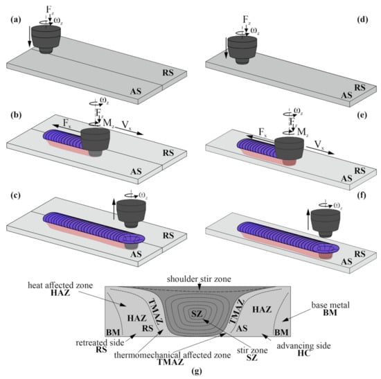 Typical process schemes for friction stir welding (a–c) and processing (d–f) and the division of the welding/processing area into characteristic cross-sectional areas (g).