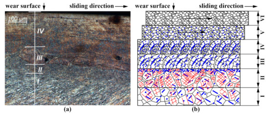 There was also intensive research into the adhesive interaction of metals and alloys under friction in the absence of a lubricant. At the initial stages of such friction processes, there is mainly plastic deformation of material with the subsequent reorientation of the crystal lattice and formation of a fine grain structure, which was shown using monocrystalline materials [168,169,170,171]. With an increase in the degree of deformation of the materials under adhesive friction, the features of plastic flow in the near-surface friction zone become more complicated [5,172,173,174]. The results of [5,175] indicate the formation of a surface layer with a nanoscale grain structure and low shear stability in adhesive friction conditions. Metal flow in such a layer can be similar to that of a viscous fluid and occur in both laminar and turbulent modes [174,175] (Figure 2). A higher degree of deformation of the material as the loading force increases leads to a more intense outflow of the material from the friction zone and transition to the extrusion friction mode [176]. A number of simulations show that material extrusion conditions occur in the tool–material contact zone [177,178], but the processes inherent to adhesion contact are often not taken into account. Other works describe the process of welding or friction stir welding as a stepwise process of plastic deformation of the material, formation of the ultrafine-dispersed structure of the transfer layer, and its movement from the zone in front of the tool to the stir zone due to its adhesion to the tool [130]. In [127], it was shown that in friction stir processing of aluminum alloy 2024, the formation of structural elements similar to those observed in adhesion friction occurs (Figure 2b). There is also the formation of the heat-affected zone I with a slightly changed structure of the base metal; the plastic deformation zone II; the fragmentation zone III and zone IV or zone of thermomechanical affect; and the zone of metal flow along the contour of the counterbody or tool V and VI (Figure 2b). These zones differ both in the degree of plastic deformation of the material and in the intensity of its structural-phase changes. For example, when a high degree of deformation occurs in layers III–VI, secondary phase particles refine and dissolve in the aluminum matrix and are released from the supersaturated solid solution upon cooling. At the same time in zones I and II, the thermal and strain effects are insufficient for either the process of intensive dissolution of particles or their separation from the solid solution. At the boundary of zones II and III, the secondary phase particles precipitate and enlarge with the formation of large incoherent S-phase precipitates due to relatively high thermal and low strain effects. In layers V and VI, the metal flows along the contour of the tool or counterbody, with the layers closest to the friction surface being set in motion by adhesive bonds with the tool, and those further away by cohesive and extrusive forces [127].