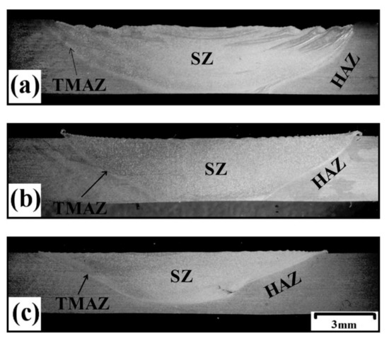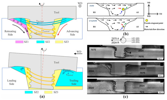 Metal flow during friction stir welding in transverse and longitudinal direction: heterogeneity of stir on the advancing and retreating sides. Reprinted with permission from [98] 2022, Elsevier (a), a formation of pseudo-statement point. Reprinted with permission from [99] 2017, Elsevier (b), and mixing of materials in the longitudinal section. Reprinted with permission from [100] 2011, Elsevier (c), see Figures 6–8.