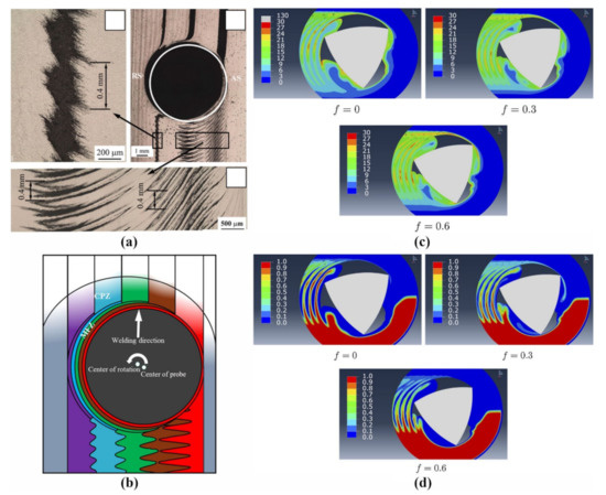 Features of metal transfer in friction stir welding, defined with the use of marker material: material structure after experiment (a) and schematic representation (b) (Reprinted with permission from [102] 2016, Elsevier) distribution of equivalent plastic strain (c), and mixing (d) of materials in friction stir welding with a triangular tool (Reprinted with permission from [191] 2017, Elsevier).