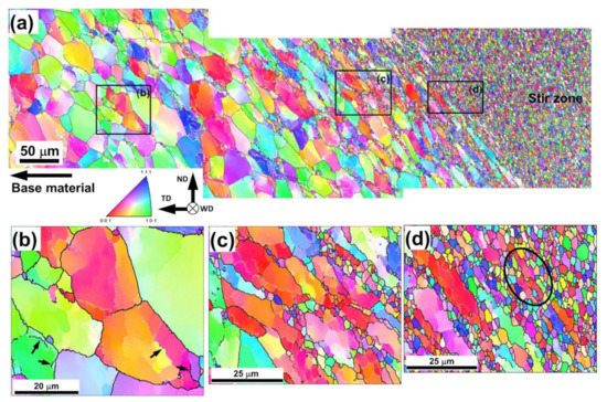 Grain refinement in friction stir welding of the aluminum alloy Al-Mg-Sc (a) Composite map from thermo-mechanically affected zone; (b) structure of TMAZ closer to the basic metall; (c) central part of TMAZ; (d) Structure of TMAZ closer to stir zone. Reprinted with permission from [212] 2019, Elsevier.