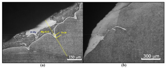 The interaction of materials with limited solubility and significant differences in melting temperatures leads to the formation of intermetallic phases in the stir zone [298,300,301]. Intermetallide phases formed in welded joints of aluminum alloys and copper alloys, such as brasses, contain copper, aluminum, and zinc [292,293,299,300,301]. Various types of defects can form on the boundary of aluminum alloy and brass, which is associated with the formation of eutectics or large interlayers of intermetallides between the plates to be welded [292,293,301]. Brittle Al2Cu, Al4Cu9, and CuZn intermetallides were found in the stir zone in the AA5083/CuZn34 weld joint [301]. The thickness of the intermetallide layer depended on the rotational speed of the tool and the welding speed.