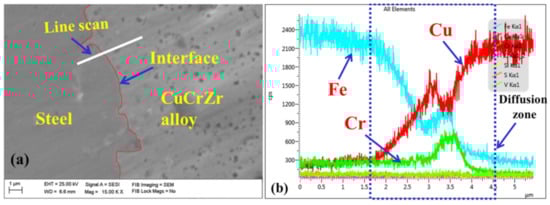 Wear of steel H13 tools during friction stir welding of copper alloy Cu-Cr-Zr SEM image (a) and the variation of the chemical element concentration at the boundary (b). Reprinted with permission from [267] 2019, Elsevier.