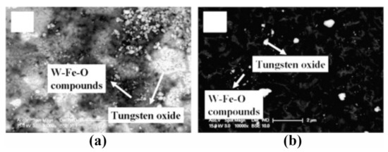 Wearing hard-alloy tools in friction stir welding occurs in a rather complex way [284] (Figure 8). This paper suggests 3 basic mechanisms of wear with the realization of deformation and fatigue failure of binder, surface oxidation, and formation of complex W-Fe-O compounds, as evidenced by the formation of corresponding elements on the tool surface (Figure 8). The application of the tool modified by Ni and Cr3C2 allowed an increase in the wear resistance of titanium alloy due to the reduction in oxidative wear intensity (Figure 8a,b).