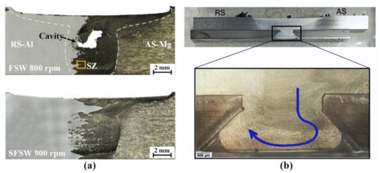 Structure formation in samples of dissimilar joints obtained by friction stir welding of aluminum and magnesium alloy (a). Reprinted with permission from [302] 2022, MDPI. Features of metal flow and structure formation when joining heterogeneous alloys based on titanium and aluminum (b). Reprinted with permission from [308] 2023, MDPI.