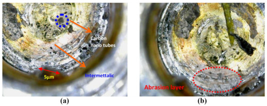 HSS steel tools when welding aluminum alloy and copper [321] can experience both adhesion and abrasion wear due to the formation of intermetallic phases (Figure 10). The additional introduction of carbon nanotubes into the weld material led to the formation of carbides that increased the abrasive wear of the tool pins. In this case, such intensity of wear, as in the welding with a steel tool of copper or its alloys, does not occur in this case.