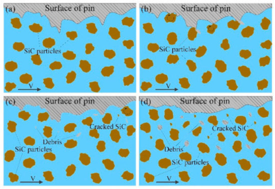 Schematic representation of the tool wear process during production of SiCp/Al composite material. Different stages of the tool pin wear process (a–d). Reprinted with permission from [339] 2022, Elsevier.