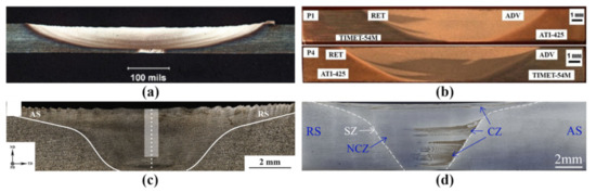 Cross-section structure after friction stir welding and processing of titanium alloys Ti-6Al-4V (a) (Reprinted with permission from [369]) 2010, Elsevier) ATTI-425 and TIMET-54M (b) (Reprinted with permission from [352] 2016, MDPI), pure titanium (c) (Reprinted with permission from [378] 2019, Elsevier) and TA5 (d) (Reprinted with permission from [107] 2022, Elsevier).