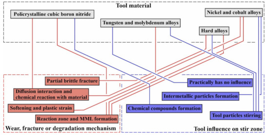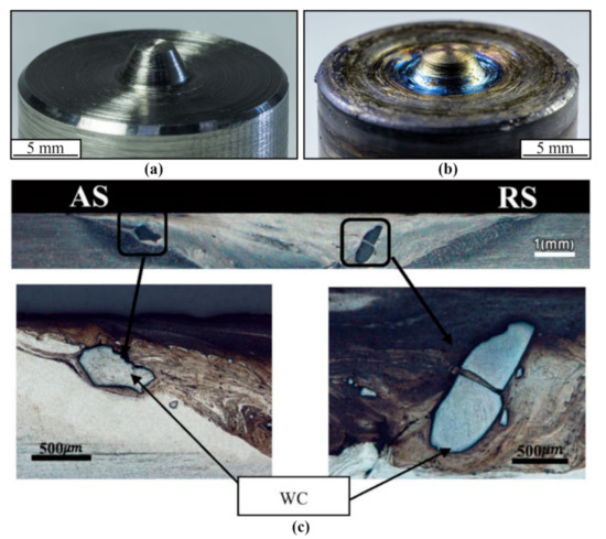 The processes of friction stir welding of titanium alloys with aluminum alloys are widely investigated. These groups of alloys are most commonly used in the aviation and space industries, so their welding is of great industrial interest [28,309]. Since titanium alloys are involved in the welding process, a welding tool is subjected to high thermomechanical stresses, due to which tools made of tool steel are very rarely used. Tungsten carbide tools with cobalt additives [310] as well as tungsten-rhenium tools [183] are mainly used in welding and processing titanium and aluminum alloys.