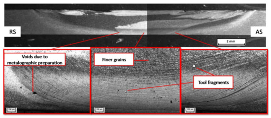 Nickel alloys are highly heat-resistant. Therefore, their intense thermomechanical interaction with the tool surface during the frictional stirring action can be assumed. Under these conditions, the introduction of tool wear particles or diffusion of tool material elements into processed material is possible. For example, when welding Inconel 625 alloy, striped tool wear structures usually occur in the material. Research papers [280,281,282] presented an analysis of Inconel 625 and 718 alloy welds in which EDS analysis detected W in the joint material, presumably as a result of WC-Co tool wear. However, EDS analysis and SEM studies showed no cobalt in the processed material. Similarly, when alloy 600 was welded with a pcBN tool, a small grain size area containing small boron nitride wear particles was observed in the stir zone. It was concluded that grain growth during cooling was locally prevented by the presence of boron nitride particles at the grain boundaries [283].