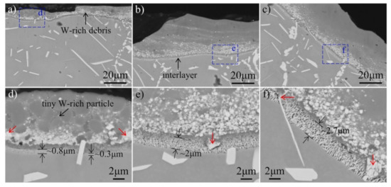 When welding copper alloys, steel tools are subjected to intense wear. In work [267], the phenomenon of self-optimization of the tool from steel H13 appeared during the wear process, and the greatest intensity of wear was in the first 300 mm of the welding path. The contact of tool and material does not lead to the formation of an intermetallide layer or tribological layer of variable composition (Figure 7a), which is characteristic of the Cu-Fe system. Only a thin diffusion layer is present on the surface of the tool and the adhered material (Figure 7b). This indicates that in copper welding, the wear mechanism of the steel tool may be related to the gradual thermal degradation of its structure due to a sufficiently high process temperature [267]. Additionally, a significant role can be played by the softening of the surface layer as a result of the formation of solid solutions on the surface of the tool.