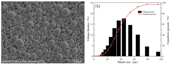 TC11 titanium alloy powder was prepared by the aerosol method. EDS was used for component detection, and its chemical composition is shown in Table 1; the main component was titanium. The microstructure of TC11 titanium alloy powder photographed by SEM is shown in Figure 1a. The powder generally presents an approximate regular spherical shape with a smooth surface, an absence of other impurities, and good wettability. The Winner2000 laser particle size analyzer was used to measure the particle size of TC11 powder. The particle size distribution is shown in Figure 1b. The particle size of the powder was mostly distributed in the range of 15~53 μm with a Gaussian distribution, which met the printing requirements of the equipment.