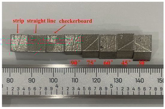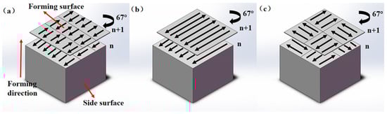 The 8 × 8 × 8 mm block specimen model was created using SolidWorks software (version2016, Dassault Systemes, Paris, France). To investigate the effects of scanning strategy, a scanning strategy as shown in Figure 2 was designed. All three scanning strategies utilized a layer-by-layer rotation of 67° for the interlayer scan lines. For the intra-layer scan, the strip strategy divided the 2D cross-section into three regions, which were scanned in an adjacent region order using a simple back-and-forth alternating scan within each region, with the vectors of adjacent regions parallel to each other. The linear scanning strategy employed a straightforward “back and forth” scanning mode throughout the entire plane. Lastly, the chessboard scanning strategy divided each constructed slice into four small regions resembling a chessboard pattern and selectively melted each region in random order using a simple alternating scanning vector, with paths in adjacent regions perpendicular to each other []. Furthermore, the plane perpendicular to the forming direction is referred to as the forming surface, whereas the plane parallel to the forming direction is known as the side surface.