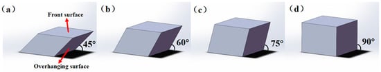 The forming angle, which is also known as the sloping angle, refers to the angle between the side of the formed specimen and the substrate, whose side is also known as the overhanging surface. The plane perpendicular to the forming direction is called the front surface. If the sloping angle is too small, the overhanging surface tilts to a greater extent, and the specimen is prone to deformation such as warpage deformation, cracking and other phenomena []. Therefore, in the actual forming process, support is usually added to the part where the tilt angle is less than 45°. With complex parts in the actual printing process, the angle is usually between 45° and 90°. In order to study the effect of forming angle, 45°, 60°, 75°, and 90° tilt angles were selected for specimen printing as a basis for exploring the best placement of complex structural parts, as shown in Figure 3.