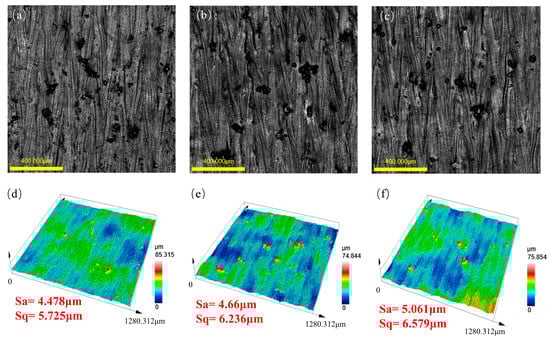 Side morphology and roughness with different scanning strategies: (a,d) strip; (b,e) straight line; and (c,f) checkerboard.