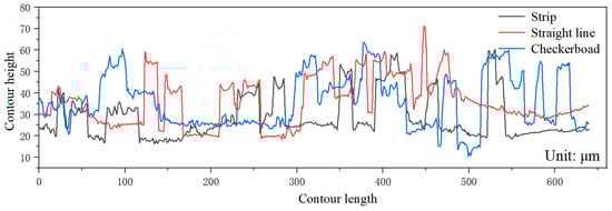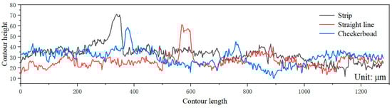 The side surface morphology and side roughness of the formed parts are shown in Figure 7. Because the angle between the middle layer and the layer rotates 67 degrees during the sample forming process, the elliptic welds overlap with each other, resulting in a certain unleveling phenomenon on the side of the sample formed under the three scanning strategies. Additionally, the laser remains for a while when it reaches the edge of the forming surface, so the powder melting time at the edge is longer than in the middle of the molten pool, resulting in serious powder adsorption phenomenon. In addition, the powder is fused through heat conduction, and the energy decreases in the process of transfer. Partial powder also appears due to incomplete melting, which affects the forming quality of the side surface []. Figure 8 shows the height change in the line profile on the side. Compared with the front, the curve has obvious changes, with a large number of peaks and troughs, and the distance between the peaks and troughs is further widened. The results of roughness measurement show that the side roughness of the samples formed under the three scanning strategies of strip scanning, straight scanning and checkerboard scanning is at the same level and is higher than that of the front surface.