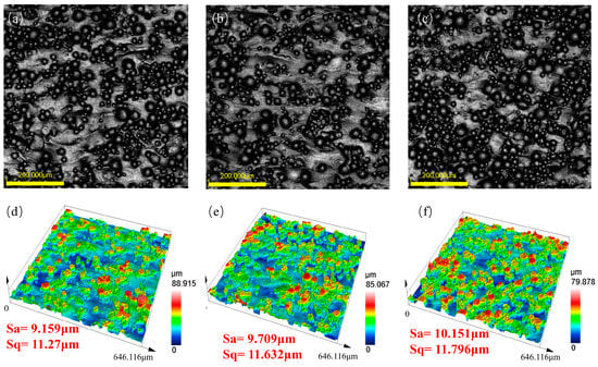 Frontal morphology and roughness with different scanning strategies: (a,d) strip; (b,e) straight line; and (c,f) checkerboard.