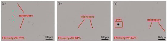 Table 2 shows the average microhardness values under three scanning strategies. The microhardness of linear scanning is greater than that of the other two scanning strategies, mainly because the checkerboard scanning strategy and strip scanning strategy are both partitioned scanning strategies, and the scanning line length is smaller than that of single-fill linear scanning. Due to the short scanning line length, the scanning time of the two adjacent scanning lines is relatively short when laser is applied to the powder surface. The temperature gradient in the scanned area decreases, and the cooling rate decreases, so that the overall temperature of the forming surface is higher and the growth time of the grains is sufficient. As a result, the grains are coarse and the number of grain boundaries of the whole sample is reduced. When subjected to external forces, the obstacle to dislocation movement is reduced and the hardness is only low []. Therefore, the microhardness of the checkerboard and strip scanning samples was lower than that of linear scanning, and the value for checkerboard scanning was greater than that of strip scanning. After laser scanning a region, the adjacent region can be preheated by heat conduction. The preheating times are longer so that the overall temperature gradient is smaller and the grain is coarser, resulting in a decrease in hardness. The Archimedes drainage method was used to measure the density of the samples under different scanning strategies. The samples were ground and polished for metallographic observation. The results are shown in Figure 9. The density of the samples reached more than 98.67 %, indicating that the overall forming quality of the samples was good, and that selection of the laser parameters was reasonable. The density of the straight line scanning sample was higher than that of the other two, and the density of the chessboard scanning sample was the lowest. The corresponding metallographic diagram also shows that there are certain pores and micropores in the chessboard scanning sample. The overall surfaces of the straight line and the strip samples are smooth, without cracks or large pores but with individual tiny pores. This is due to the excessive overlap between the scan partitions of the chessboard sample, which easily leads to defects such as pores, thereby reducing its hardness.