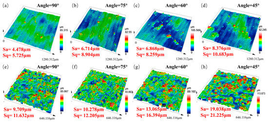 Roughness of the front (a–d) and overhanging, (e–h) surfaces of samples at different overhang angles.