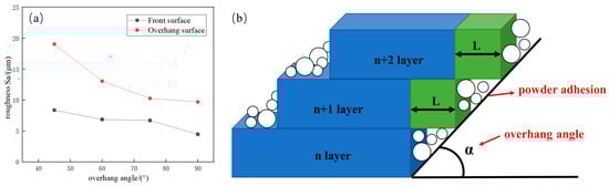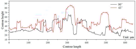 Figure 10 and Figure 12a, show changes in the roughness of the specimen’s frontal surface and overhanging surface with different overhang angles. It can be seen that the roughness values of the frontal surface and overhanging surface are affected by the overhang angle. The front roughness is lower than that of the overhanging surface on the whole, and a complete banded weld can be observed, which is generally smooth and locally raised, mainly due to the spheroidization phenomenon caused by the splashing powder. The overhanging surface roughness changes greatly, the surface is uneven, and even folds appear. There are many granular bulges, and the bulges become more serious with decreases in the overhang angle. Figure 11 shows the height variation diagram of the line contour at the overhang angles of 90° and 45°. It can be clearly observed that, on the whole, the 45° curve is higher than the 90° curve and that the distance between the crest and trough also further increases. This indicates that the overhang angle is the key factor affecting the surface quality of the overhanging surface, and the smaller the overhang angle, the worse the surface quality. Due to the technological characteristics of L-PBF, there is a “step effect” on the overhanging surface, and the effect is more obvious when the overhang angle is larger, which is conducive to powder adhesion. At the same time, an increase in the overhang angle also leads to an increase in the overhang area, which is supported by powder, and the laser energy cannot be transferred in time. The energy concentration causes the volume of the molten pool shrink, resulting in an increase in unit energy density []. The metal powder particles under the laser sintered layer are easily melted, resulting in a serious powder adhesion phenomenon on the overhanging surface, which increases the surface roughness. The “step effect” is shown in Figure 12b.