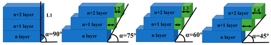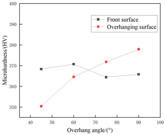 Figure 13 shows the microhardness of the front and overhanging surface of the sample under different forming angles. It can be observed that different forming angles have little influence on the front microhardness but have great influence on the overhanging surface. With increases in the forming angle, the microhardness shows an increasing trend. This is because the forming quality of the overhanging surface is affected by the overhang length (L) between two adjacent layers. When the laser is applied to part L, the forming process is suspended over the metal powder, and the thermal conductivity of the support area of the powder is only 1/100 of that of the corresponding formed body []. The low thermal conductivity leads to the timely transmission of thermal stress. Coupled with the effect of structural stress and residual stress, plastic deformation occurs on the overhanging surface. The melted powder sinks into the powder layer below due to the action of capillary forces and gravity [], resulting in poorer forming quality. As shown in Figure 14, when the forming angle is smaller, the overhang length (L) is longer, and L1 < L2 < L3 < L4. The greater the amount of deformation subsidence, the larger the decrease in forming quality and hardness.