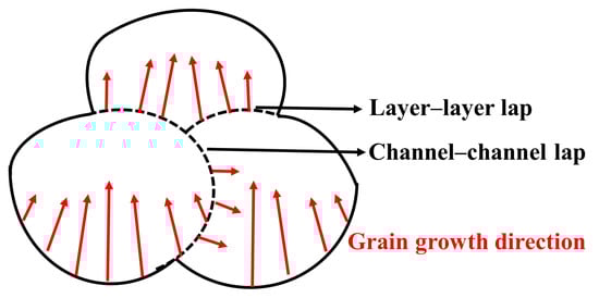 In addition, it was found that the hardness of the side of a specimen formed with forming angle under 90° is higher than that of the front. This is because the front is the forming surface, the adjacent melting road is the “channel–channel” lap, the side is the deposition surface, and the adjacent melting road is the “layer–layer” lap. After the laser processes a layer, it needs to be paved with powder before processing the next layer, and the processed layer, therefore, has enough time to cool down. When processing the next layer, the temperature difference “layer to layer” is greater than that “channel to channel”, and the grain grows along the direction of the fastest heat dissipation, so the direction of grain growth is mostly vertical, resulting in the grain orientation on both sides of the weld boundary of the “layer to layer” lap being basically consistent []. As shown in Figure 15, the grain orientation on both sides of the weld is the same, and the microhardness increases when the weld is stressed more evenly, that is, the “channel–channel “lap is better than the “layer–layer” lap. When the forming angle changes, the lapping condition of the overhanging surface is between “channel–channel “lapping and “layer–layer” lapping []. Therefore, with decreases in the forming angle, the overhanging surface tends to the forming plane, and the higher the proportion of “layer–layer” bonding, the greater the microhardness of the sample.