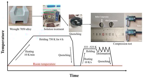 The solid solution treatment and compressing processes are shown in Figure 1. The wrought 7050 alloy was heated and solution treated at 750 K for 4 h with 333 K water quenching. The quenched alloys were prepared into some cylinders of Φ8 × 12 mm for subsequent compressive tests. The warm upsetting tests were conducted on a Gleeble−3180 unit at different temperatures of 333, 423, 473, and 523 K for strain rates of 10−3, 10−2, and 10−1 s−1. The total reduction is 50%, with stress-strain data recorded automatically. Before upsetting, tantalum with graphite lubricant was applied to the surfaces of both specimens and dies to minimize the friction effect. The specimens were heated at 10 K/s to deformation temperatures and then held for some time to eliminate the temperature gradient and microstructure inhomogeneity. The room-temperature compression tests of forged and solid solution states were carried out on a WDW-100 universal tester (Beijing Sinofound Co., Ltd, Beijing, China). The strain-stress curves are recorded by the tester automatically.
