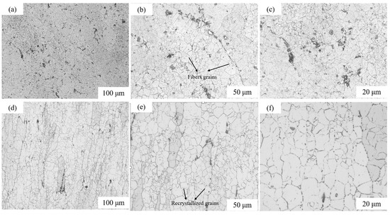 Optical micrographs of 7050-aluminum alloy before and after solid solution treatment (a–c) Before solid solution treatment; (d–f) After solid solution treatment.