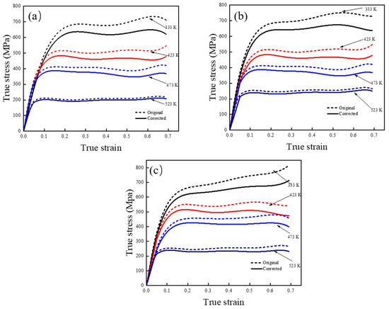 The flow stress of solid solution-state 7050 alloy in different conditions: (a) 0.001 s−1; (b) 0.01 s−1 (c) 0.1 s−1.