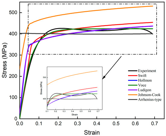 The flow stress in the room and at medium temperature can be analyzed using Hollomon [31], Swift [32], Ludwigson [33], and Voce hardening models [34]. All constitutive models are shown in Equations (2)–(4) below:
