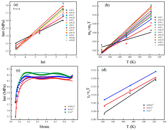 Therefore, m0 + m1T is the slope of lnσ-lnέ plot shown in Figure 8a. Then, the slopes in different conditions are shown in Figure 8b. The m0-value can be determined from the slope of plots, and the m1-value is obtained from the plots’ intercept in Figure 8b.
