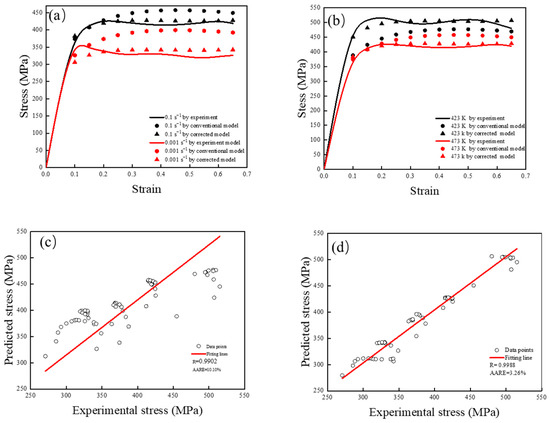 Comparisons between experimental and predicted stress by conventional and corrected Voce models: (a) 473 K at different strain rates; (b) 0.1 s−1 at different temperatures; (c) conventional model; (d) modified Voce model.