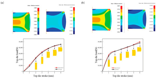Comparison between simulated and measured load-stroke curves: (a) strain rate is 0.01 s−1; (b) strain rate is 0.1 s−1.