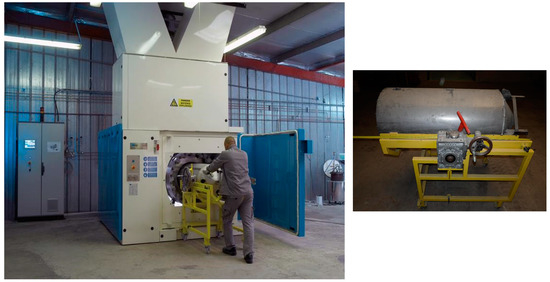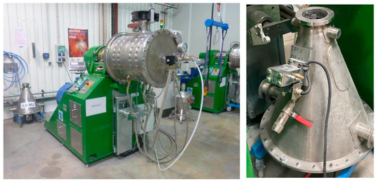The primary MgH2 granules in an amount of approximately 20 kg per batch were then HEBM-treated using a large industrial ball-miller (Zoz-GmbH, Wenden, Germany) as shown in Figure 2. This considerably reduces the dimensions of the particles to µm sizes and of the crystallites to a few tens of nm size, as illustrated by the SEM and TEM pictures shown in Figure 3. In parallel with this intense mechanical treatment carried out for about 5 h, a large density of defects settles in the grains thanks to the fragile characteristics of the hydrogenated material.